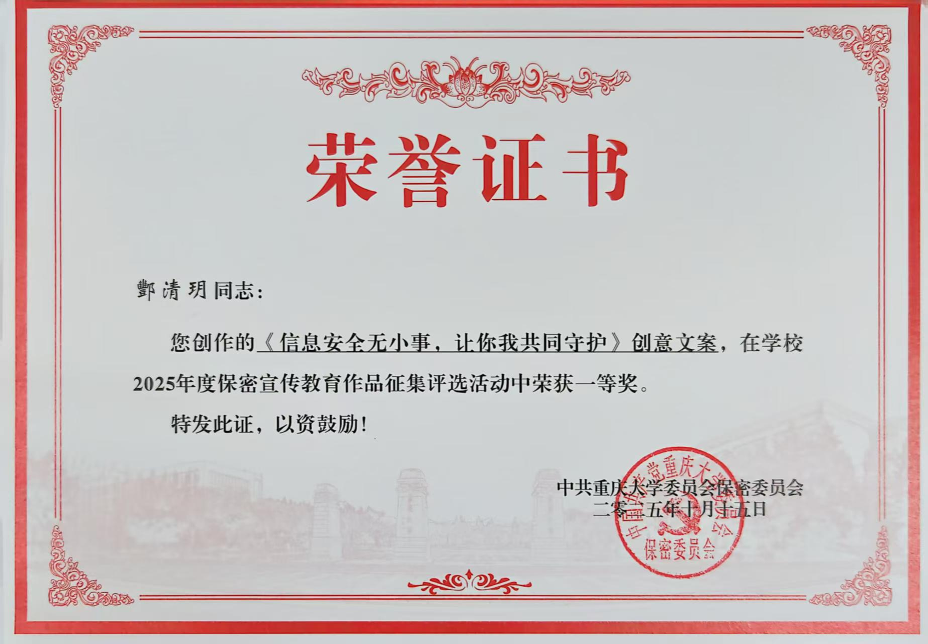 学子凭借新颖的创作思路与出色的作品呈现,在众多参赛作品中脱颖而出,斩获多项荣誉,共10名同学9件作品获奖,其中一等奖1项、二等奖2项、三等奖4项、优秀奖2项,展现了学院在保密宣传教育工作中的突出成效。