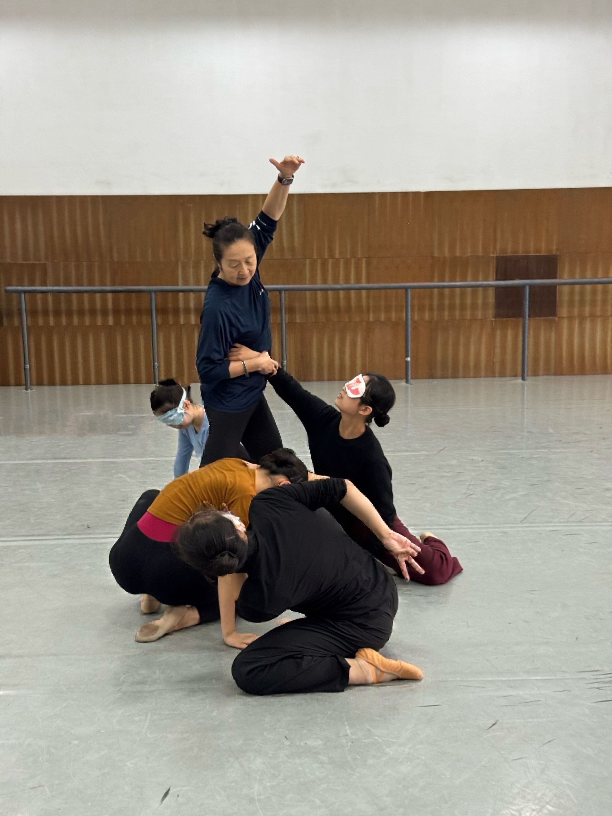 在实践环节,黄嘉敏教授提出“用身体思考,用大脑舞蹈”的教学主张,设计多维度沉浸式训练模式。双人蒙眼牵引训练中,学生通过触觉反馈与能量传导,深化对肢体协作的感知;流动牵引环节则通过“走、跑、跳”的动态转换与“低、中、高”空间层次的叠加,构建团队信任网络,使参与者切身体验到“感官关联性”在舞蹈创作中的核心作用。即兴舞蹈训练部分,以“盲人”为主题,学生分组抽取《假如给我三天光明》《推拿》等经典文本,创作出《自我》《破》《曙光》《视听漫游记》等舞蹈小品。这种剥离视觉依赖的创作实践,不仅探索了感知美好的新维度,更在协作创作中强化了团队沟通与问题解决能力。