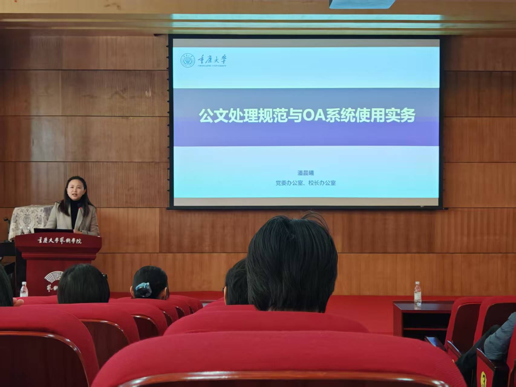 党政办邀请学校党办校办秘书科副科长潘晨曦来学院开展了“公文写作与OA系统操作使用培训”。培训会由学院党政办主任史沁主持。党委书记蒋华林到会并提出了明确的培训要求,学院全体教职工参加培训。