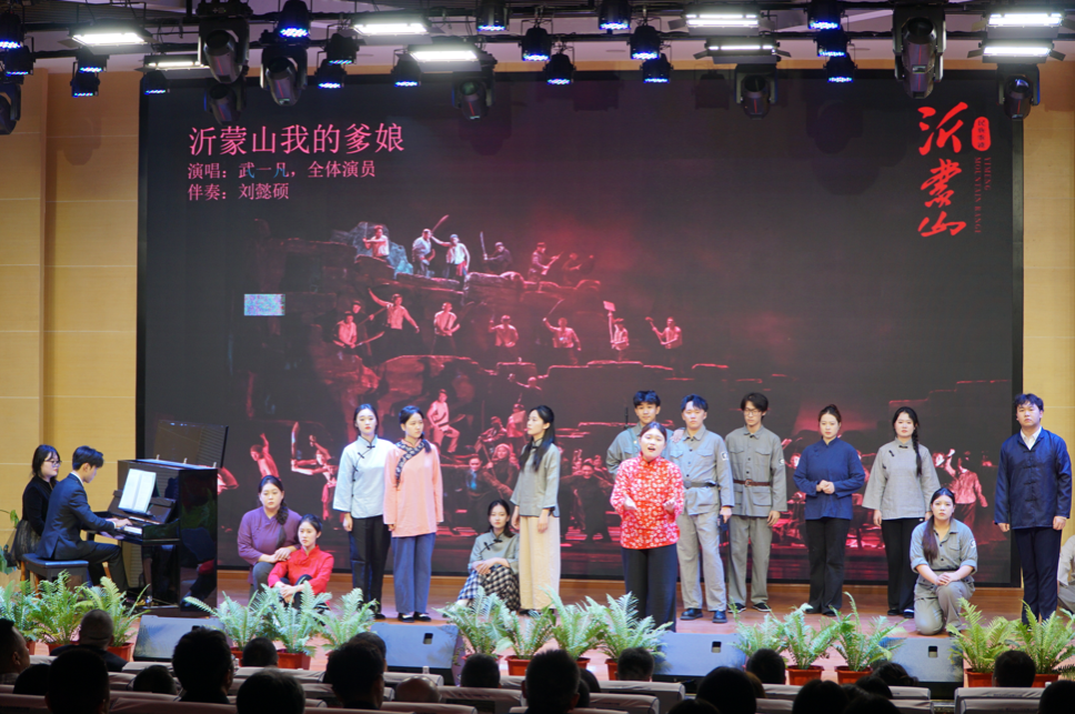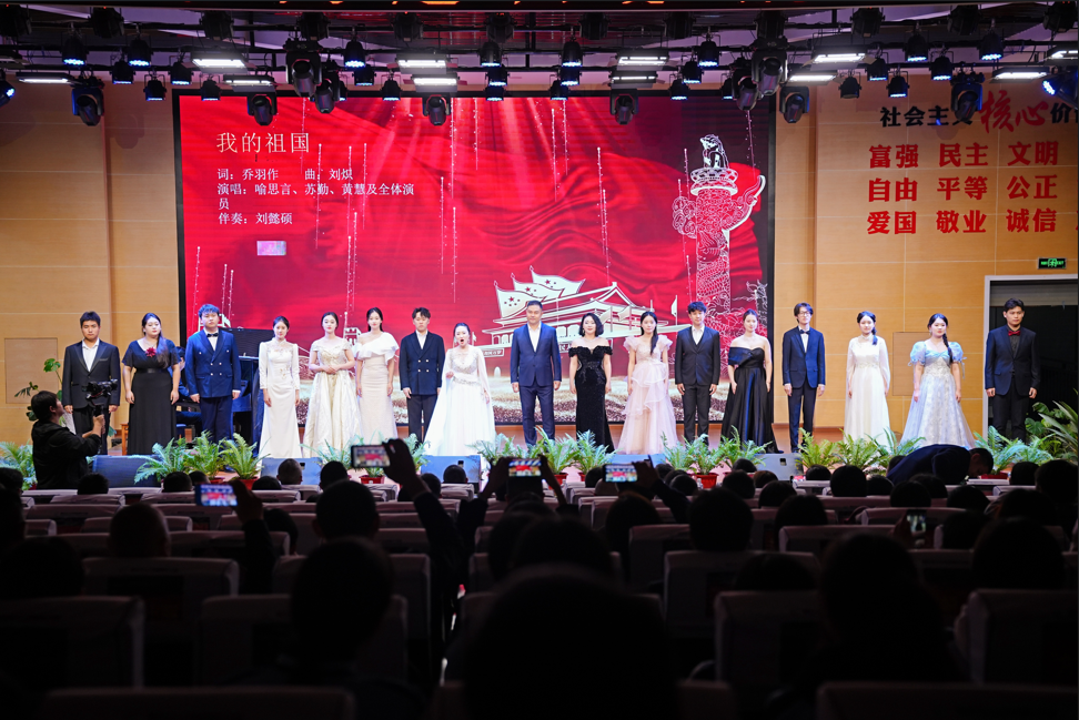 演出过程中 , 喻思言 、苏勤和黄慧三位老师还结合声乐艺术特点与作品历史背景进行专业导赏 , 引导学生深入理解音乐内涵,提升艺术鉴赏力。最后,全体与会人员共同高唱《我和我的祖国》,在激昂旋律中抒发对祖国的深情祝福 ,将现场氛围推向高潮。