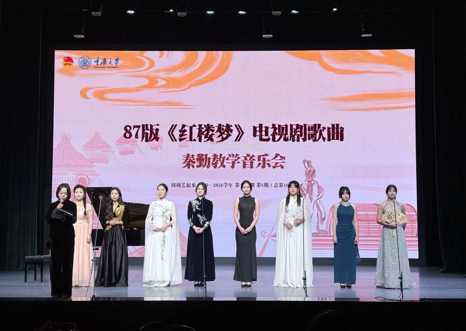本场音乐会采用“导赏+演唱”的形式,主持人秦勤的讲述串联起每首歌曲背后的意蕴与情感内核,引导观众在欣赏音乐之美的同时,更深切地体会古典诗词与旋律水乳相融的独特魅力,感悟《红楼梦》所蕴含的悲剧美学与人文精神,让师生在熟悉的旋律中,不仅重温了经典的永恒魅力,更增强了对民族优秀传统文化的认同与自信,从中汲取了温润而深厚的精神力量。
